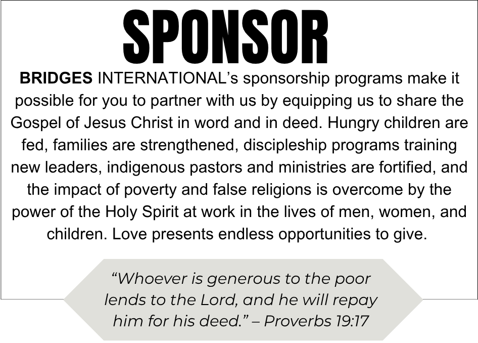 You're invited to subscribe to "BridgeBuilders", the free newsletter from Bridges International. Monthly updates from India, Brazil, Uganda, and Local missions are included in our newsletter to keep you updated. A mission-related devotional, a testimony, a shareable graphic, and/or a specific prayer request ... all included in one email each month.